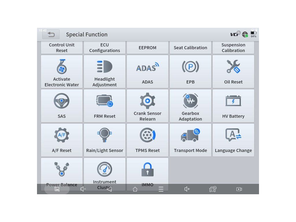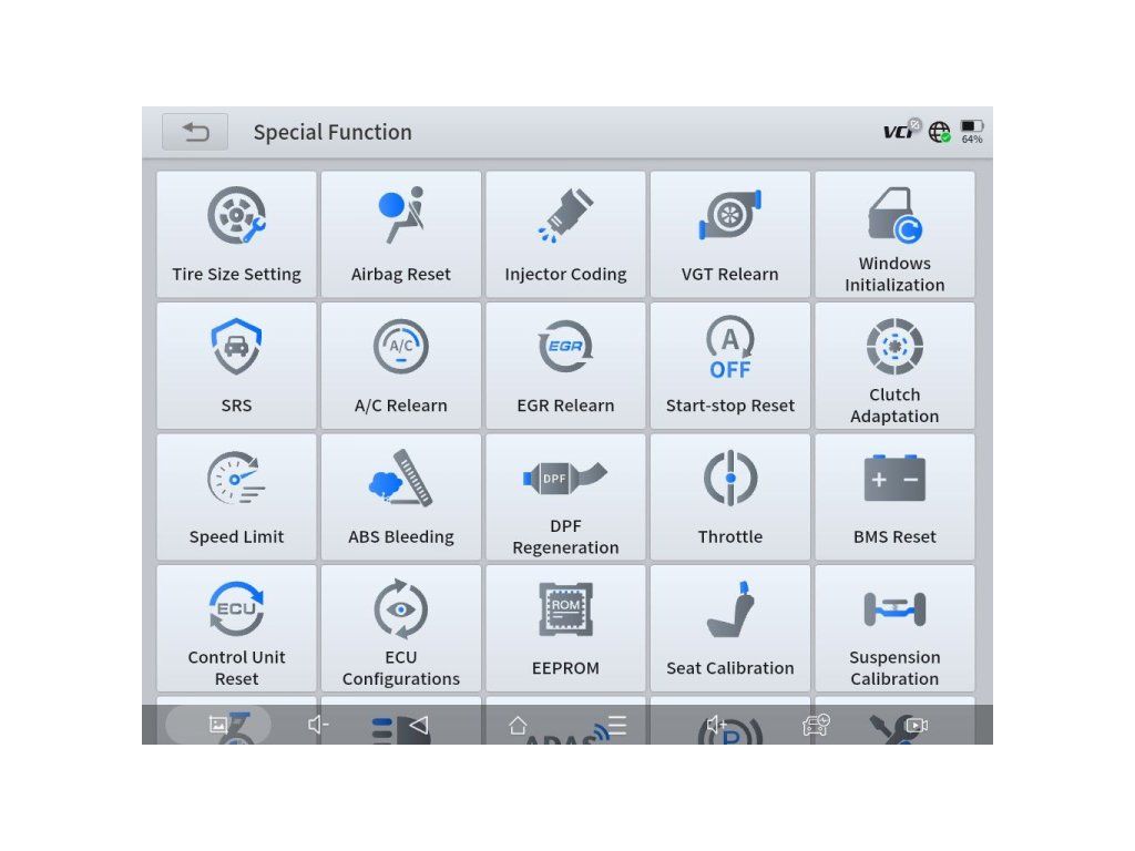 Kompletný zoznam špeciálnych funkcií: A/C naučenie, odvzdušnenie ABS, prispôsobenie ABS/ESP, ADAS, AFR adaptácia, reset airbagu, reset BMS, adaptácia snímača vačky, spojková adaptácia, reset riadiacej jednotky, reset CPS, regenerácia DPF, konfigurácia ECU, EEPROM, zábeh EGR, reset EPB, adaptácia EPS, reset FRM, adaptácia prevodovky, regenerácia GPF, svetlomety, HV batéria, prístrojový panel, kódovanie vstrekovačov, zmena jazyka, nulovanie oleja, vyváženie výkonu, senzor dažďa/svetla, kalibrácia sedadla, smart control, obmedzovač rýchlosti, reset štart-stop, inicializácia strešného okna, adaptácia podvozku, reset TCM, adaptácia škrtiacej klapky, nastavenie veľkosti pneumatík, reset TPMS (EU/US/JP/KR/AU), transportný režim, zábeh turba, spínanie vodného čerpadla, inicializácia okien.