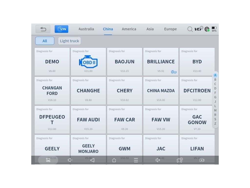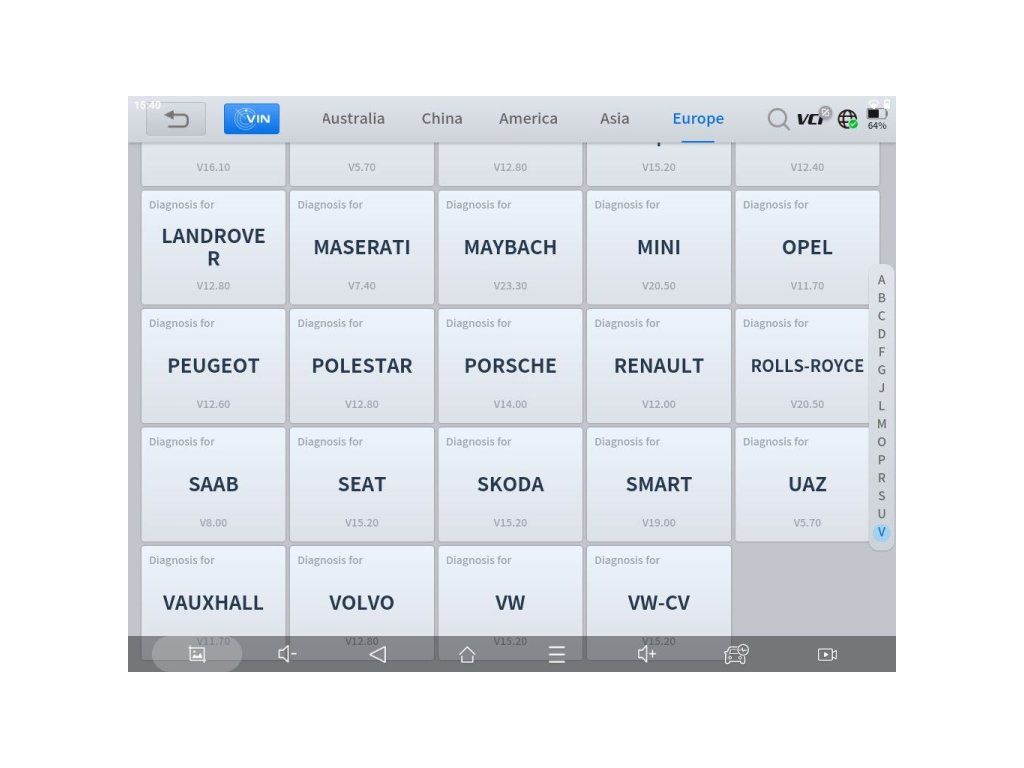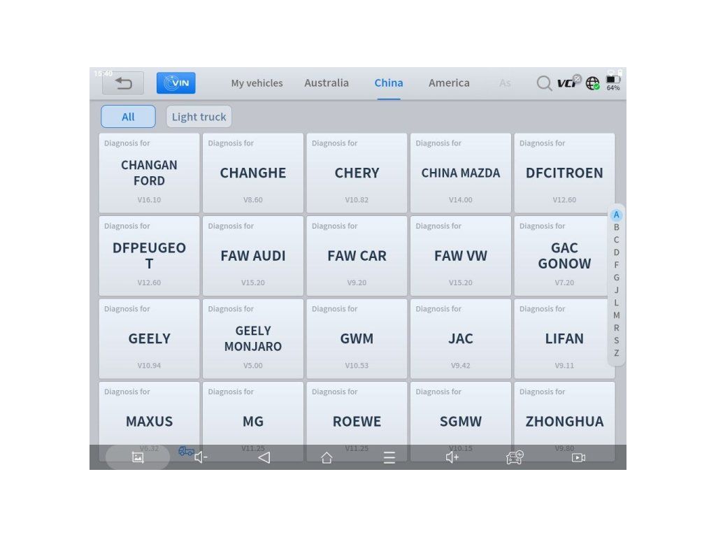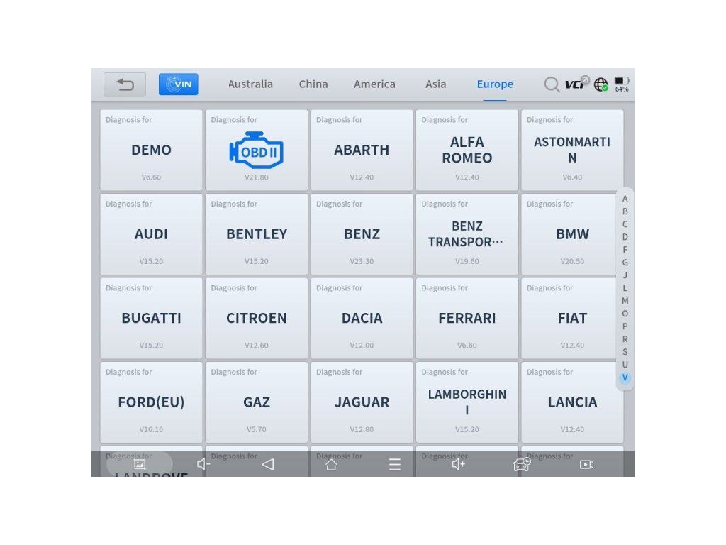 Kompatibilita s viac ako 100 značkami: Acura, Abarth, Alfa Romeo, Aston Martin, Audi, BAIC, Baojun, Bentley, Benz, Besturn, BMW, Borgward, Brilliance, Brilliance Jinbei, Bugatti, Buick, BYD, Cadillac, Changan, Changan Ford, Changfeng, Changhe, Chery, Chevrolet, Chrysler, Citroën, CVVW, Daewoo, Daihatsu, Dacia, Demo, DFPeugeot, DFCitroen, Dodge, FAW Audi, FAW Car, FAW Mazda, FAW VW, Ferrari, Fiat, Ford (AUS/EUR/USA), Foton, GAC Gonow, GAZ, Geely, Geely Monjaro, GM, GMC, Great Wall (GWM), Hafei, Hawtai, Holden, Honda, Hongqi, Hummer, Hyundai, HyundaiCV, Infiniti, Isuzu, Isuzu Thailand, IVECO, Jaguar, JAC, Jeep, Jetour, Kia, Lancia, Land Rover, Lexus, Lifan, Lincoln, Livan, Luxgen, Maserati, Maxus, Mazda, Mercury, MG, Mini, Mitsubishi, Mustang, Nissan, Nissan GT-R, OBDII, Opel, Peugeot, Perodua, Polestar, Porsche, Proton, Radar, Renault, Renault Samsung, Roewe, Rolls-Royce, Saab, Saturn, Scion, Seat, Skoda, Smart, SQTYWL, SsangYong, Subaru, Suzuki, Toyota, Transporter, UAZ, USA Ford, Vauxhall, VW, VW Expert, Volvo, Zhonghua, ZZNissan, ZZMazda, Romeo, Skyworth, Genesis a ďalšie.