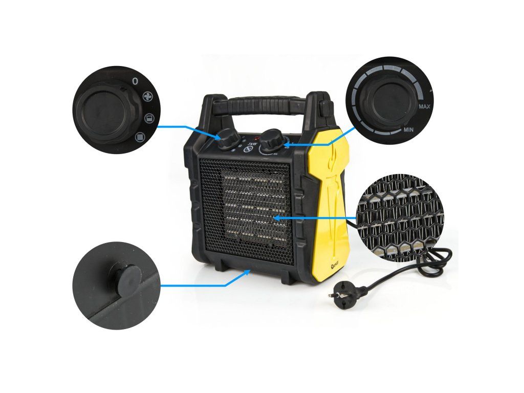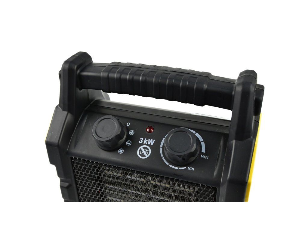 3kW elektrický ohrievač. Je vybavená keramickým vykurovacím telesom, ktoré v kombinácii so silným prúdením vzduchu zaisťuje rýchle vykúrenie miestností ako sú obchody, dielne, garáže, domácnosti a pod. Má dva gombíky. Jeden na nastavenie výkonu ohrievača, druhý je gombík termostatu na nastavenie teploty. Ohrievač prestane ohrievať po dosiahnutí nastavenej teploty. Keď teplota okolia klesne pod nastavenú teplotu, zariadenie sa opäť zapne. Konštrukcia ohrievača umožňuje nastaviť uhol prúdenia vzduchu. Má ergonomickú rukoväť na prenášanie ohrievača. Neprodukuje výpary ani nepríjemný zápach, odporúča sa najmä pre uzavreté miestnosti.