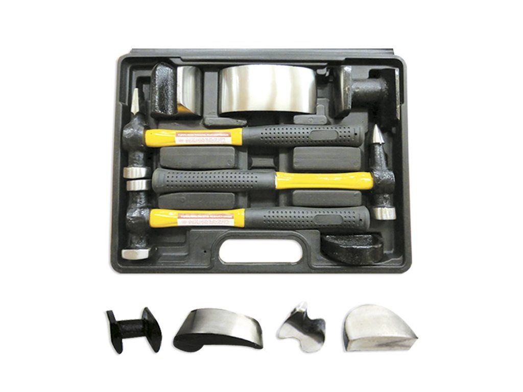 Súprava sa skladá z 3 panelových kladív a 4 vozíkov na presné opravy karosérií. Je vhodný pre väčšinu požiadaviek na opravy karosérií a tepovanie panelov. Môže sa použiť na opravu jemných priehlbín a priehlbín a môže sa použiť aj na tvarovanie panelov a vyhladzovanie povrchov karosérií automobilov. Dodáva sa v úložnom puzdre pre ľahké skladovanie a prepravu. Nástroje majú pevnú konštrukciu a sú vyrobené zo zápustkovo kovanej, tepelne upravenej ocele. S odolnými sklolaminátovými rukoväťami s gumenou rukoväťou pre odbornú manipuláciu.