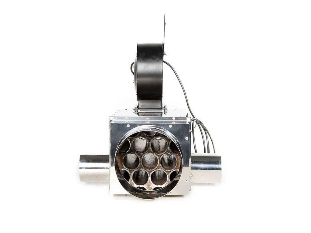 Horúce spaliny z vykurovacieho zariadenia do komína prechádzajú cez výmenník tepla a zároveň ohrievajú čistý vzduch nasávaný z miestnosti. Vďaka radiálnemu ventilátoru je ohriaty vzduch vytláčaný von cez dva výstupy teplého vzduchu.