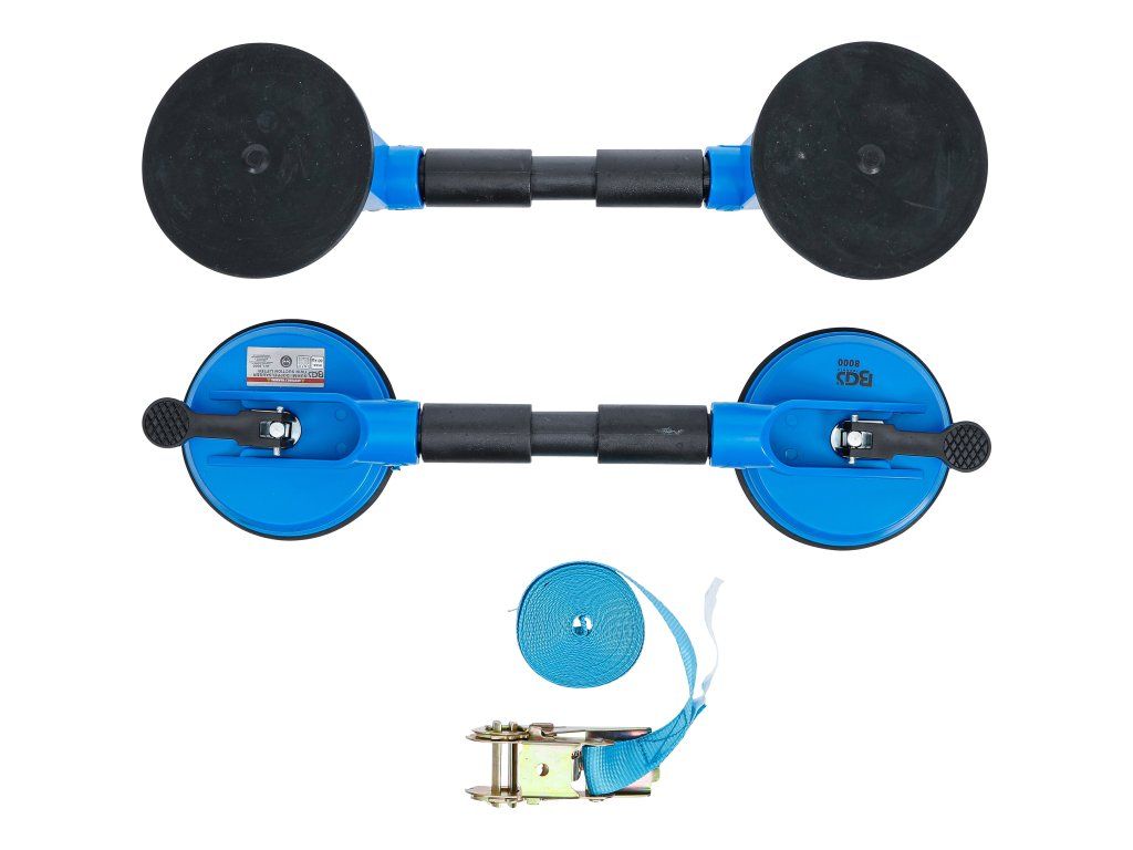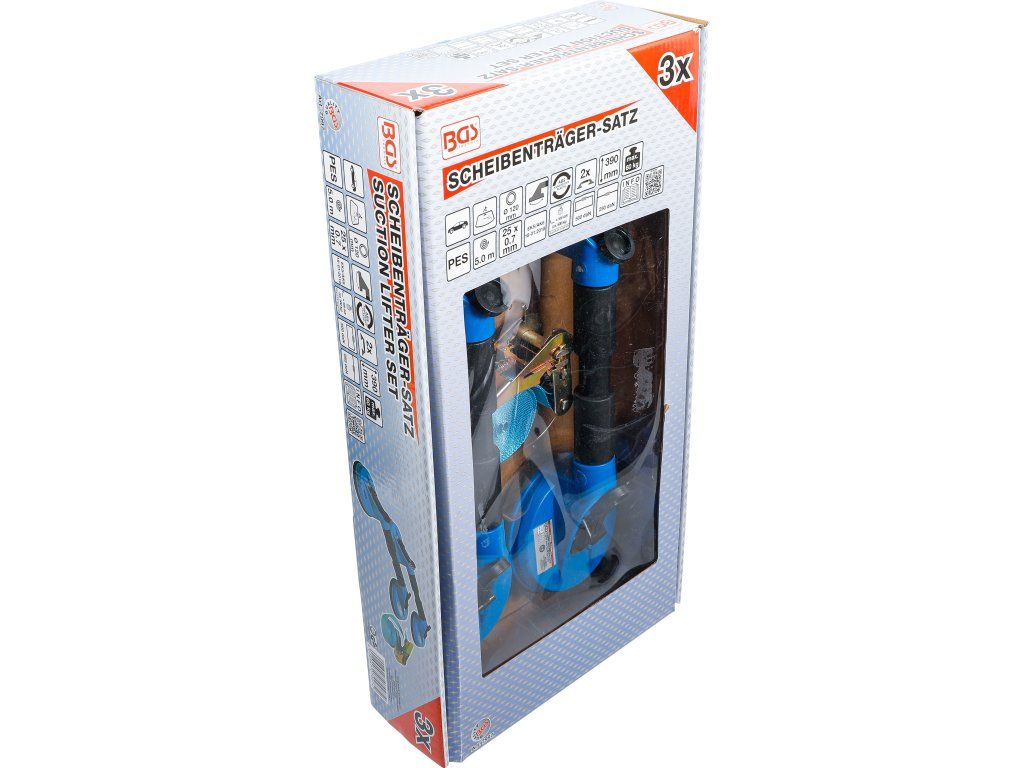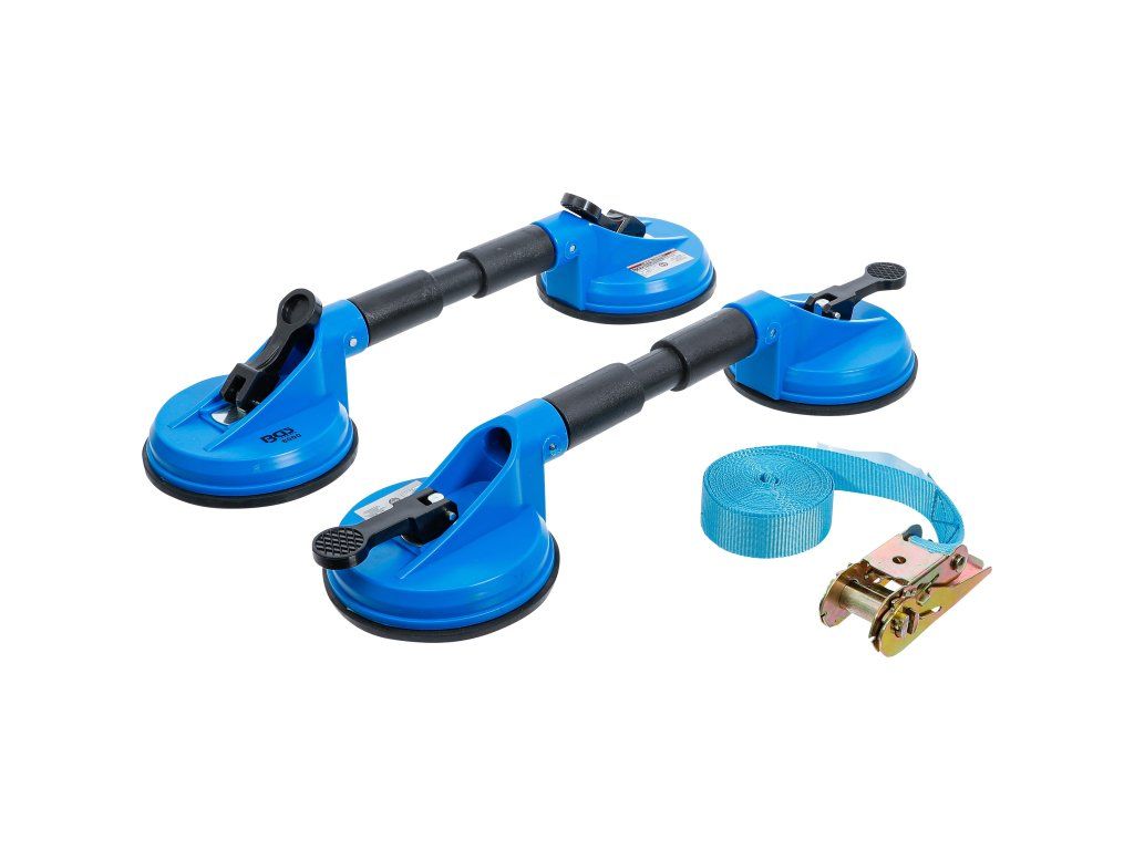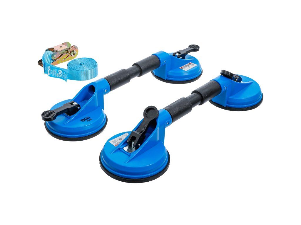 3-dielna sada prísaviek predstavuje bezpečné a efektívne riešenie na prepravu, inštaláciu a demontáž čelných a zadných skiel. Sada obsahuje dve dvojité prísavky (BGS 8000) a upínací popruh zabezpečujúci stabilitu a bezpečnosť počas manipulácie s autosklami.