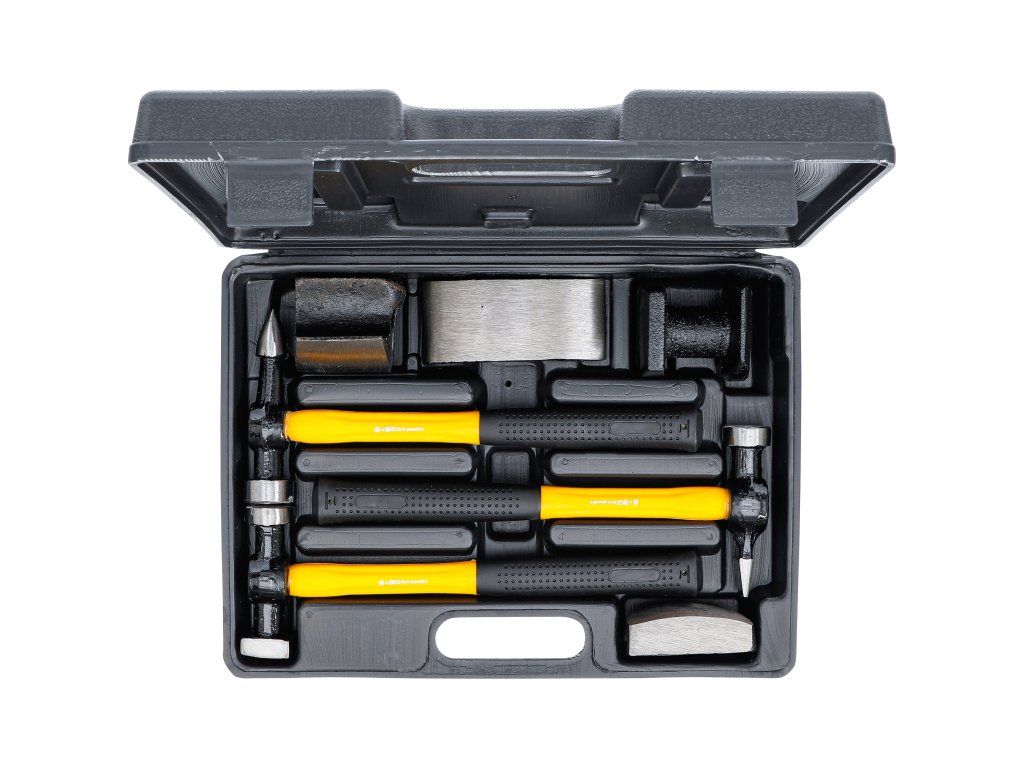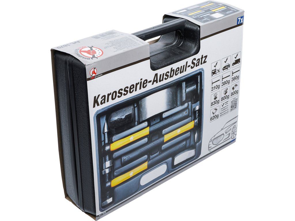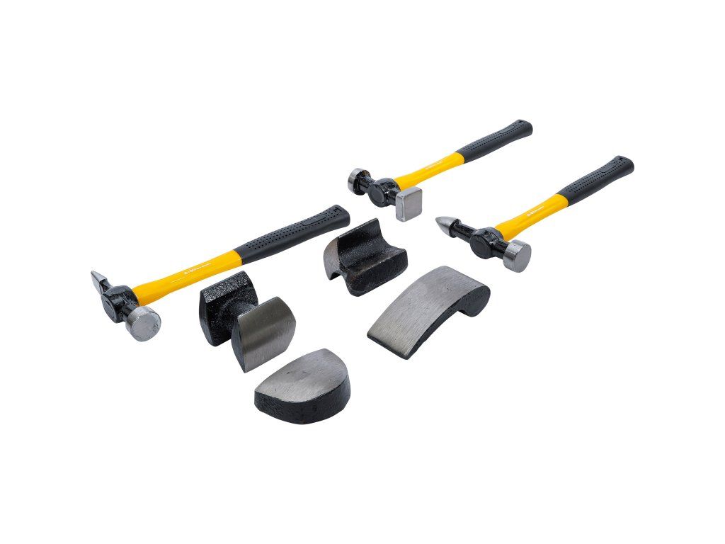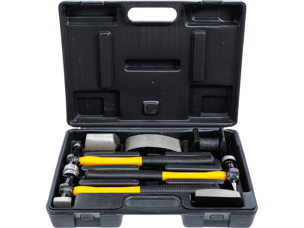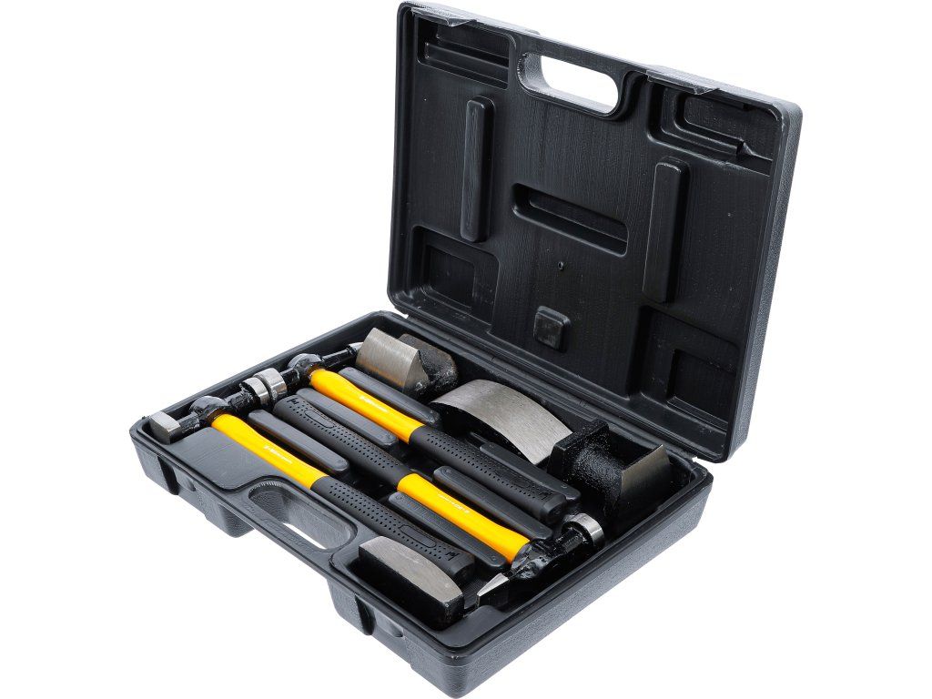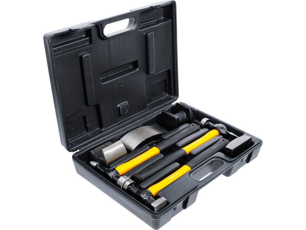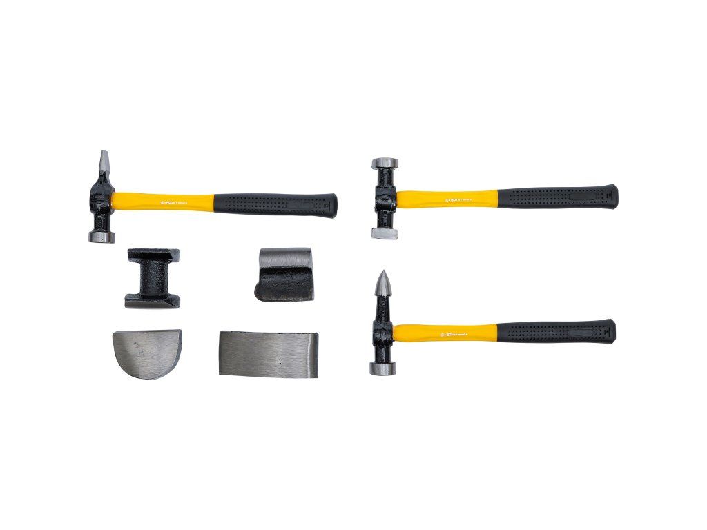 Sada na opravu karosérií, 7 ks je praktická a efektívna súprava určená na vyklepávanie, tvarovanie a rozťahovanie plechových panelov karosérií vozidiel. Ideálna pre autoklampiarov, odborníkov na renovácie a servisy. Sada obsahuje tri špeciálne kladivá a štyri tvarovacie podložky, pričom každá je prispôsobená na rôzne tvarovanie automobilového plechu.