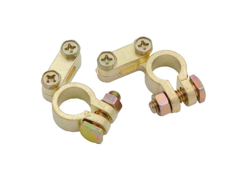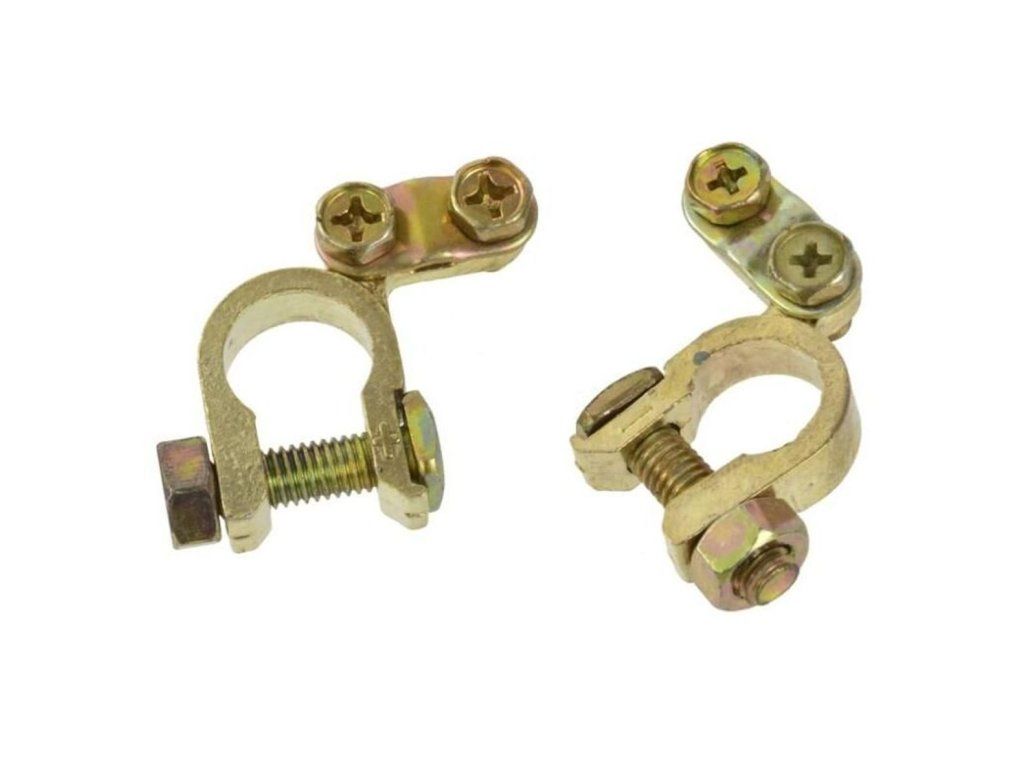 Univerzálna sada svoriek na batérie. 2ks Pozitívny aj negatívny (označené na svorke). Svorky sú vhodné pre 6V alebo 12V batérie. Vyrobené z mosadze na vedenie. Používa sa na predĺženie batérie, paralelné pripojenie a uzemnenie. Trhliny sú už vložené do svoriek pre rýchlejšiu inštaláciu. Používa sa pre autá, vozidlá, karavany a lode, ktoré majú štandardnú batériu na hornom stĺpiku (19 mm zužujúci sa kladný a 17 mm zužujúci sa záporný pól).