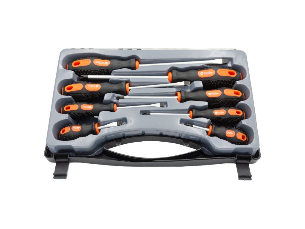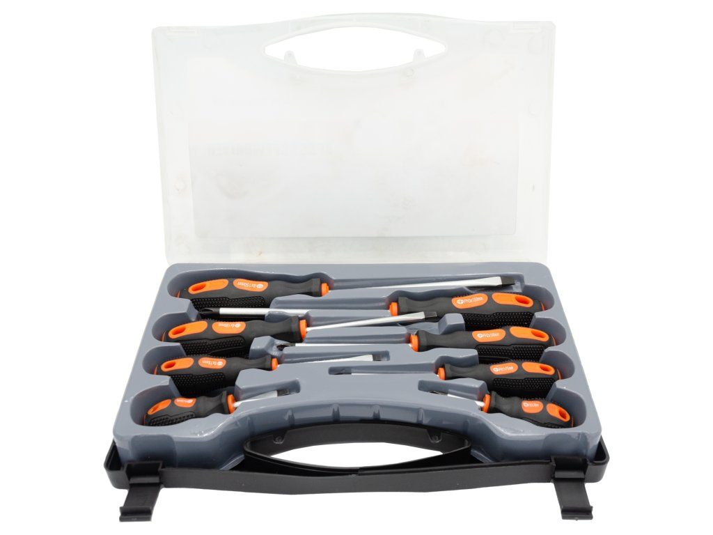 Sada skrutkovačov s 8 rôznymi veľkosťami philipov a štrbinových hláv. Vyrobené z ocele a protišmykovej plastovej rukoväte. Rukoväte majú otvory pre ľahké skladovanie. Dodáva sa v úložnom puzdre.