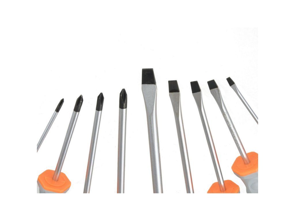 9-dielna sada skrutkovačov vyrobená z vysoko kvalitnej chróm-vanádiovej ocele (CrV) pre zvýšenú odolnosť. Sada obsahuje dva typy skrutkovačov (PH a plochý) v rôznych veľkostiach. S magnetickými hlavami skrutkovačov.