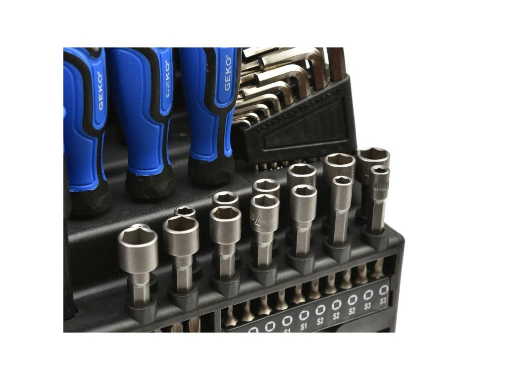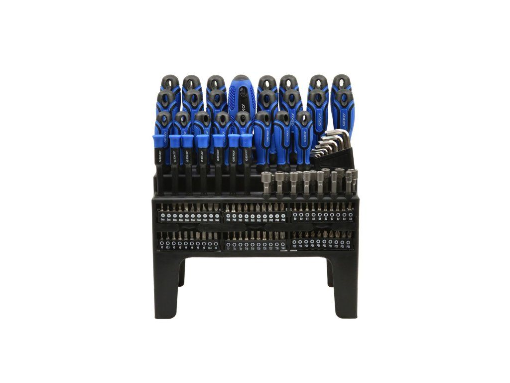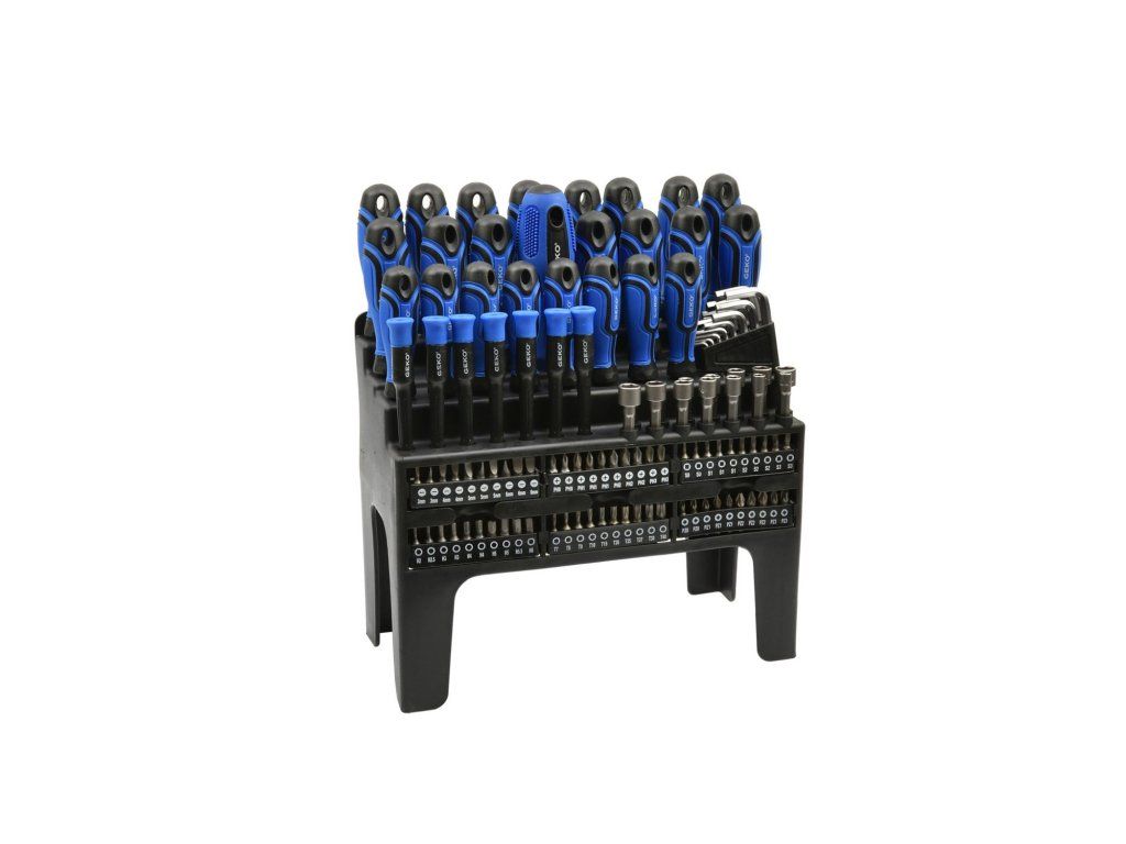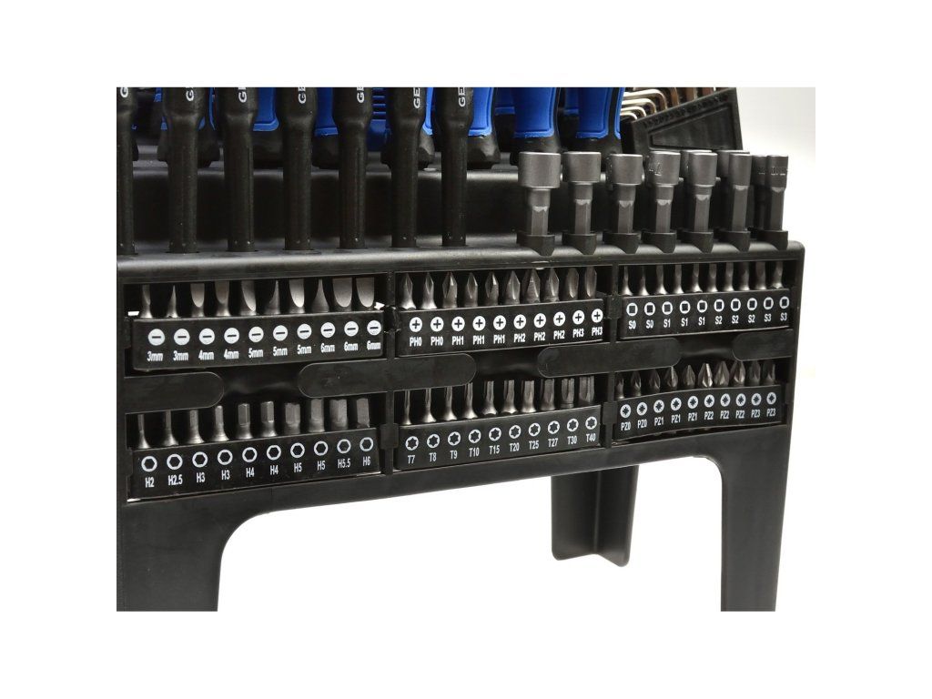 122-dielna sada skrutkovačov, bitov a nástrčných kľúčov na odkladacom stojane.