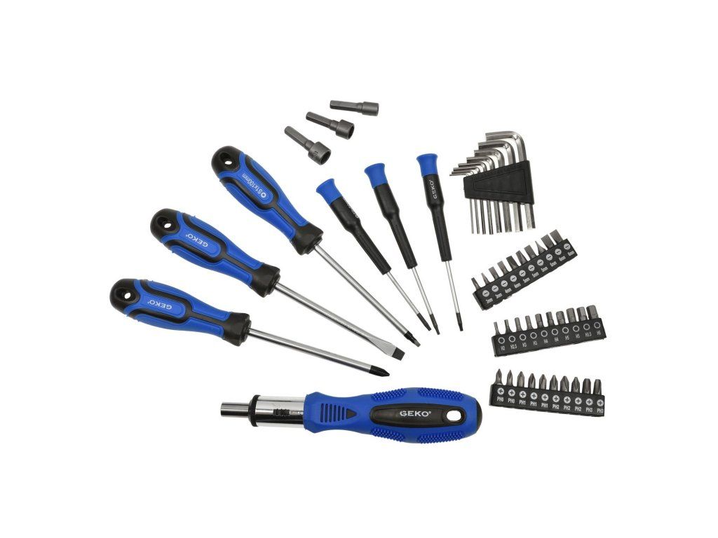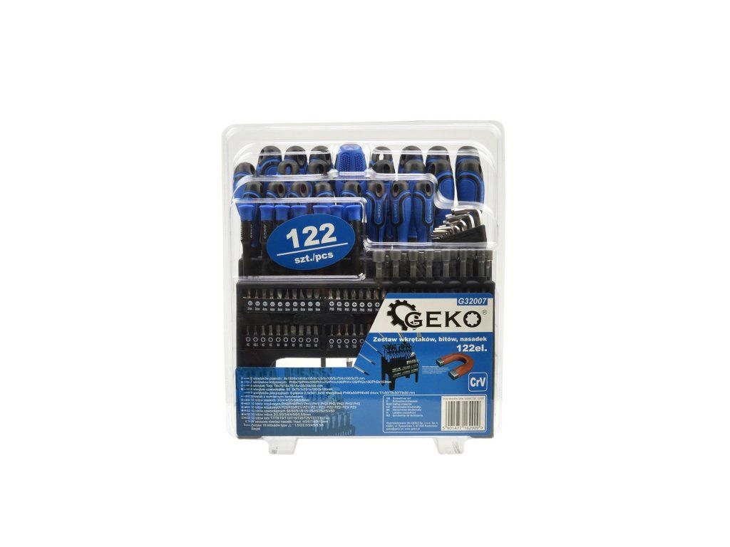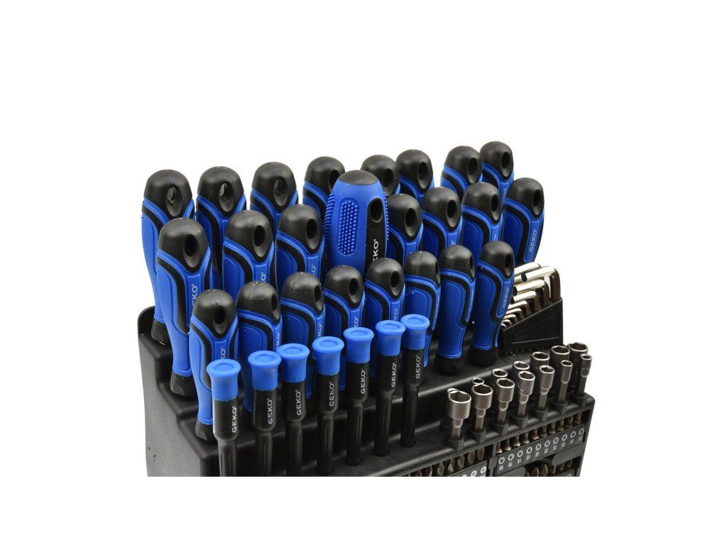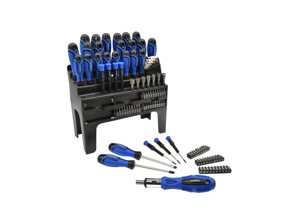 122-dielna sada skrutkovačov, bitov a nástrčných kľúčov na odkladacom stojane.