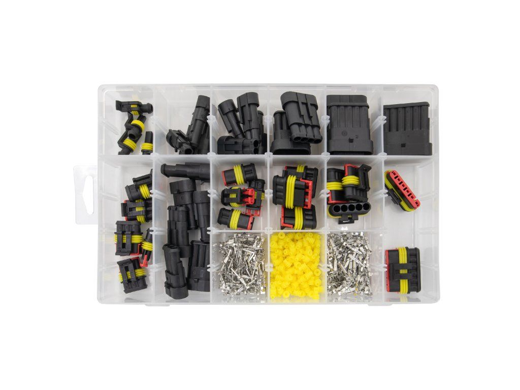 • Kompletný sortiment – obsahuje 1-6 kolíkové zástrčkové a samičie konektory, štandardné a utesnené svorky