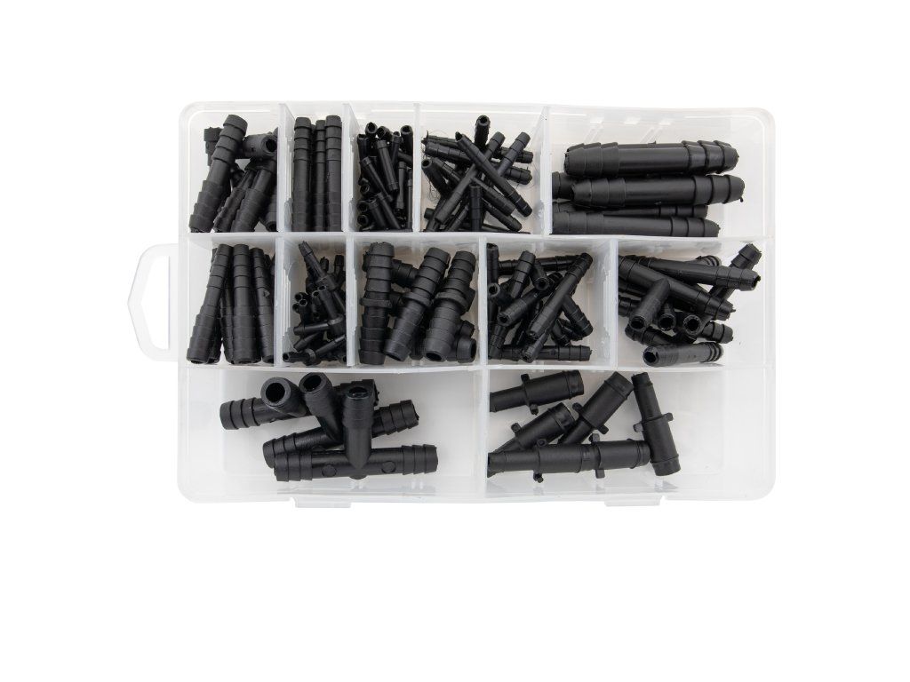 Sada obsahuje rôzne priame a T konektory vrátane štandardných a kužeľových koncoviek, ktoré zaisťujú kompatibilitu s rôznymi veľkosťami hadíc. Tieto konektory sú vyrobené z odolného plastu a poskytujú tesné a tesné spojenie a zároveň odolávajú opotrebovaniu a chemikáliám.