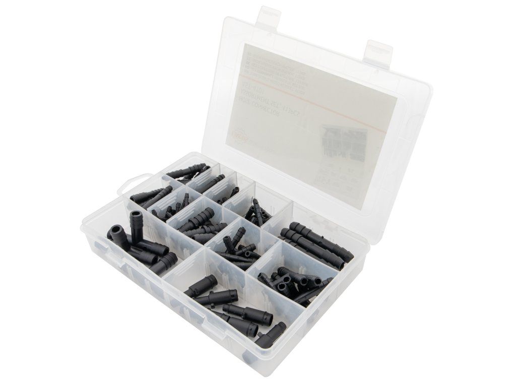 Táto 113-dielna súprava hadicových spojok je určená na bezpečné pripojenie gumených alebo plastových hadíc v rôznych automobilových, priemyselných a domácich aplikáciách. Konektory sú ideálne pre podtlakové hadice, spätné vedenie paliva, vedenie chladiacej kvapaliny a iné nízkotlakové systémy na prenos tekutín .