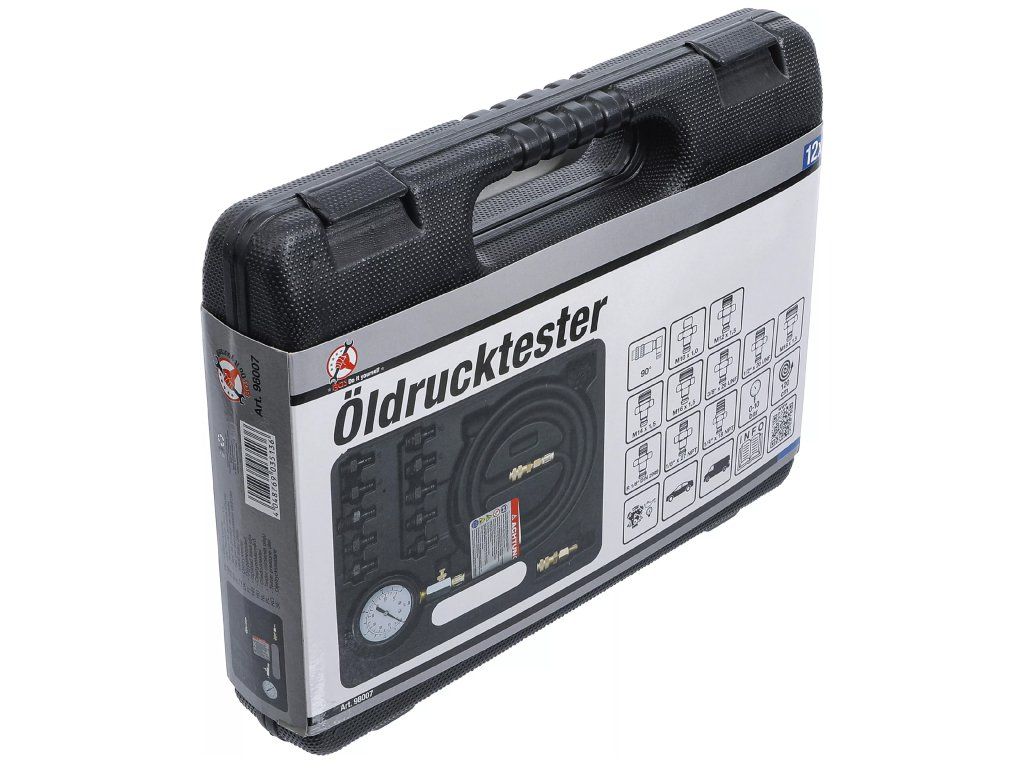 Táto sada na meranie tlaku oleja je univerzálny diagnostický nástroj na identifikáciu únikov alebo poklesov tlaku v systémoch mazaní motora. So stupnicou 0–10 bar (presnosť ±5 %) poskytuje priložený manometer spoľahlivé hodnoty, ktoré pomáhajú technikom posúdiť stav mazacieho systému.