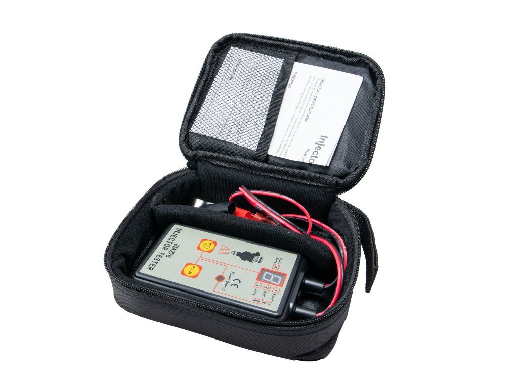 - Dodáva sa s krokodílovými sponami, pulznými výstupnými terminálmi a plátenným puzdrom na zips, ktoré chráni váš tester vstrekovačov pri preprave