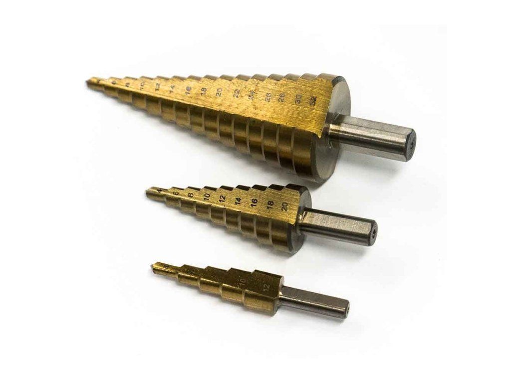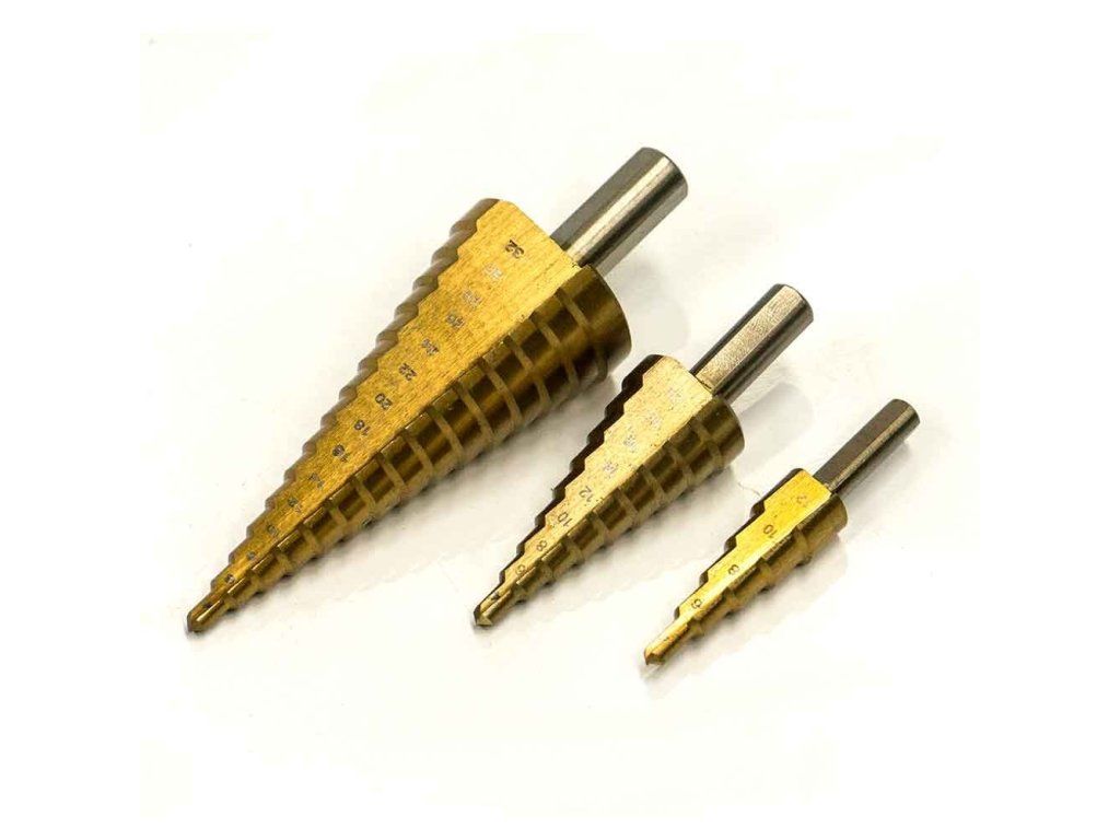 - Stupňový vrták je optimálny na vytváranie pravidelných kruhových otvorov