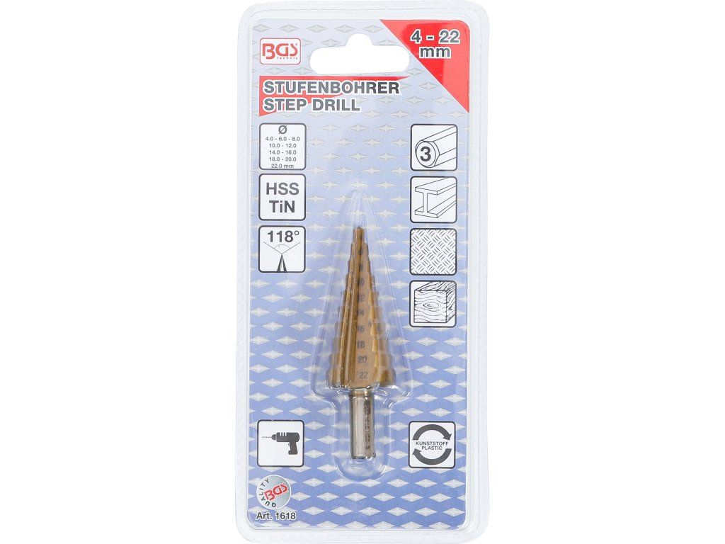 Tento vrták pokrýva rozsah priemerov od 4 mm do 22 mm so stupňami po 2 mm, čo umožňuje presnú kontrolu veľkosti otvoru bez nutnosti výmeny vrtákov. Povlak z titán-nitridu (TiN) znižuje trenie, umožňuje chladnejšie vŕtanie a zvyšuje odolnosť voči opotrebeniu.